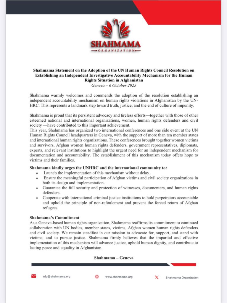 Shahmama has issued an official statement welcoming the adoption of the UN Human Rights Council resolution establishing an independent investigative accountability mechanism for human rights violations in Afghanistan.